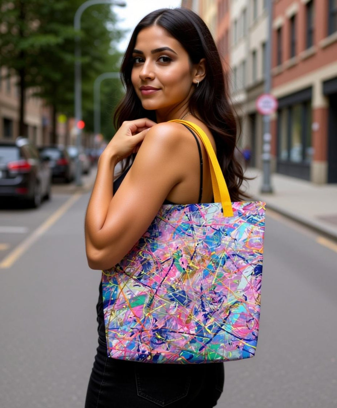 Each piece showcases the same eye-catching abstract splatter design in brilliant pinks, purples, blues, and golds - creating a cohesive luxury collection that expresses creativity and style.